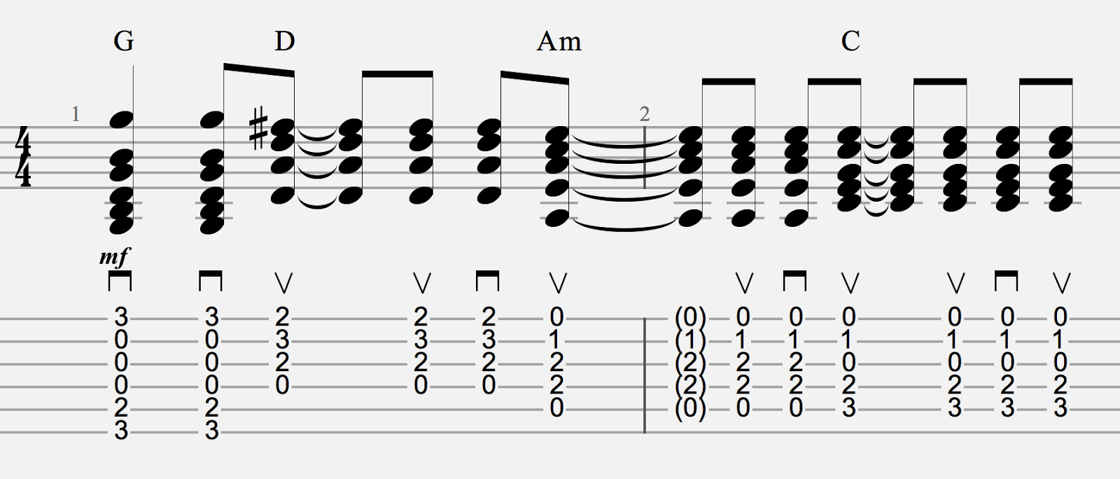 Here i’ve used exactly the same strumming pattern as we just went through but introduced 3 chord changes, from G to D to Am to C. This is a widely used pattern in many popular songs. Run to you by Bryan Adams uses this (chords are Em, G, D, A normally with capo on Fret 2)